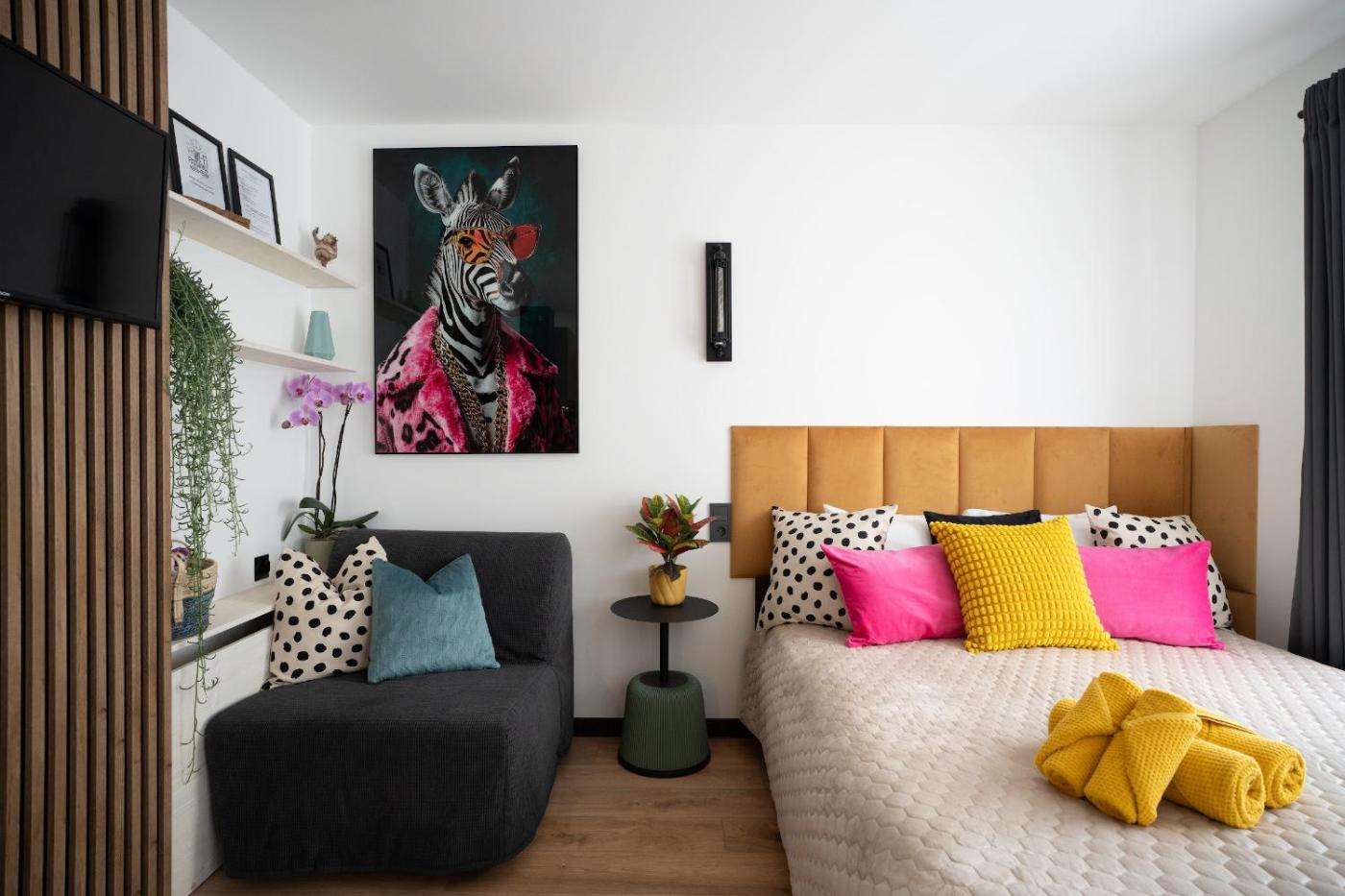 Design One-Bedroom Apartment - Tropical Forest. Providing free toiletries, this apartment includes a private bathroom with a shower and a hairdryer. Guests can make meals in the kitchen that is equipped with a stovetop, a refrigerator, kitchenware and a microwave. The apartment provides a flat-screen TV with streaming services, a washing machine, a private entrance, a tea and coffee maker as well as ancourtyard view. ;
