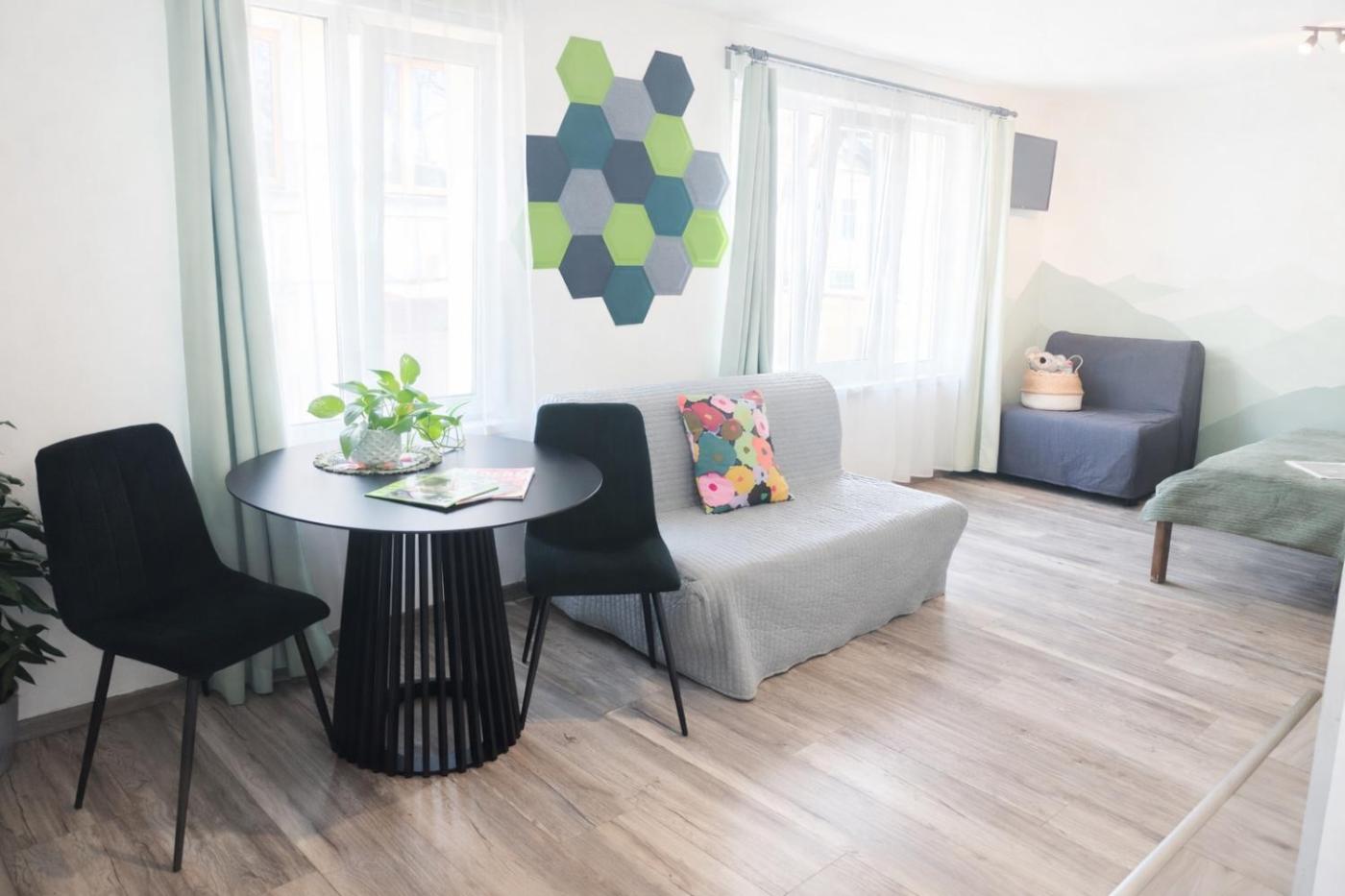 Apartment Nature. This one-bedroom apartment offers a seating area and 1 bathroom with a shower and a hairdryer. The well-equipped kitchen features a stovetop, refrigerator, kitchenware, and a microwave. The apartment provides a coffee maker, dining area, wardrobe, and a flat-screen TV. The unit offers a queen-size bed and a foldable sofa bed. ;
